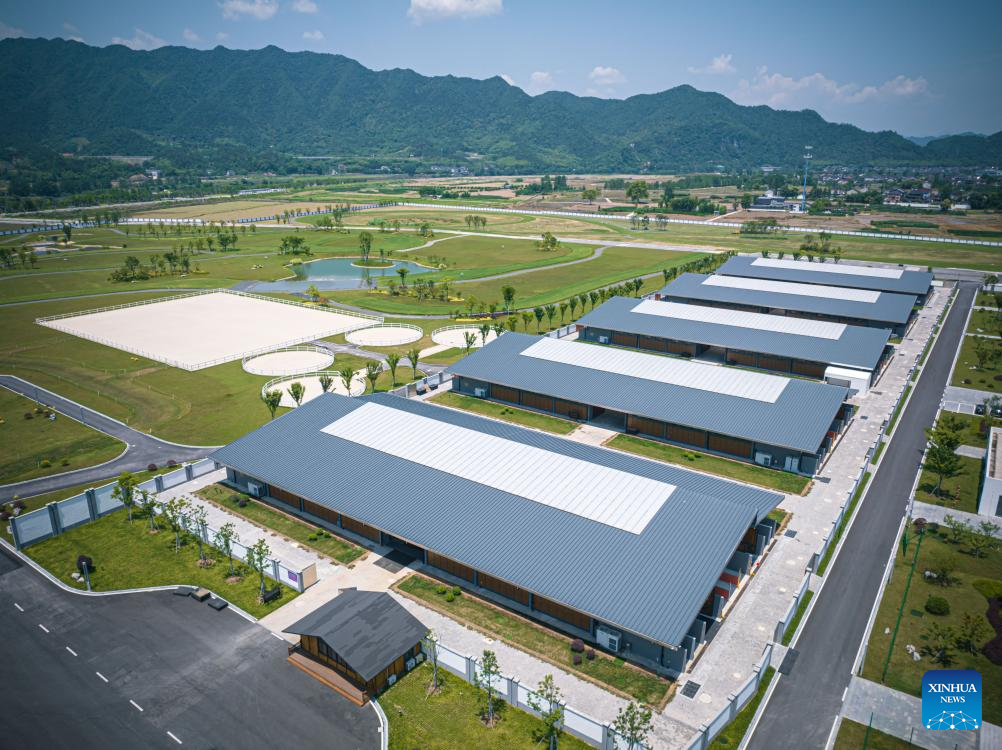 This aerial photo taken on June 9, 2023 shows the Tonglu equestrian center in Hangzhou, east China's Zhejiang Province. (Xinhua/Jiang Han)
