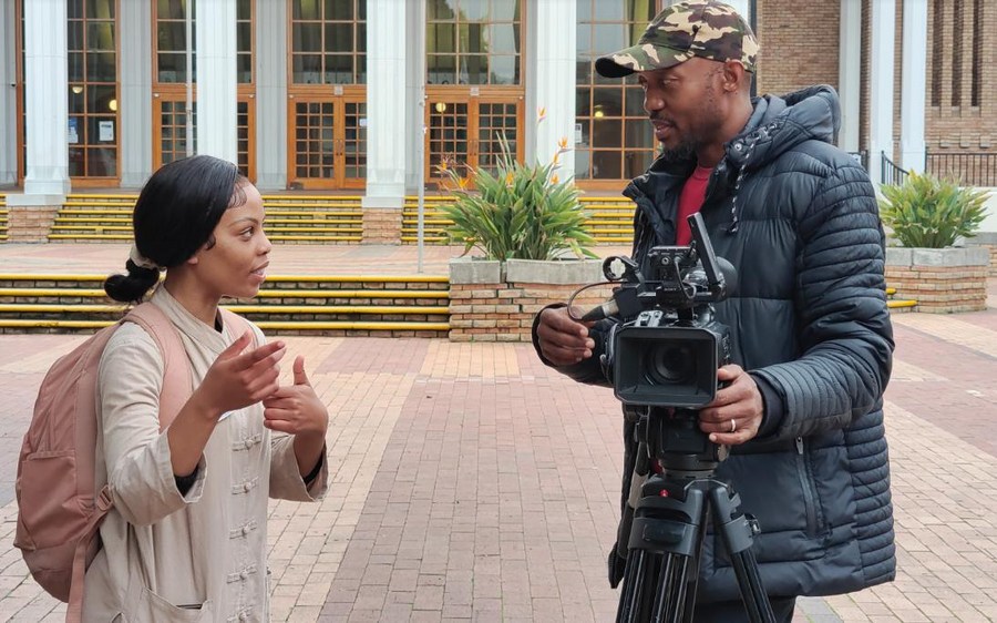 Sinovuyo Khanyisile Mkula, a student of traditional Chinese medicine at the University of the Western Cape who won the First Prize in the "My Dream" Painting Competition for African Youth with her artwork "Harmony," takes an interview in Cape Town, South Africa, on June 14, 2023. (Confucius Institute at University of Western Cape/Handout via Xinhua)