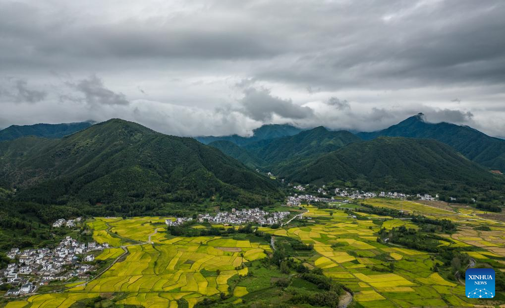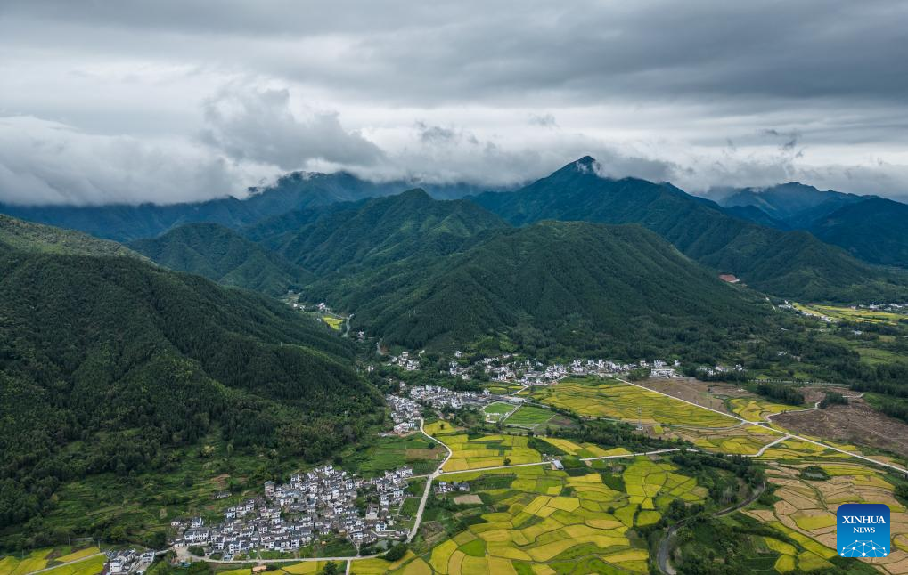 This aerial photo taken on Sept. 13, 2023 shows paddy fields in Yixian County, Huangshan City of east China's Anhui Province. (Xinhua/Guo Chen)