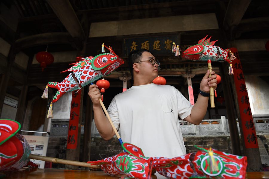 HUANGSHAN, Sept. 14 (Xinhua) -- The fish-shaped lantern parade is an important traditional cultural and folk activity in Shexian County of Huangshan City, located in east China's Anhui Province. During the first month of the Chinese lunar calendar, local people carry fish-shaped lanterns through ancient alleyways, attracting tourists from all over the country.