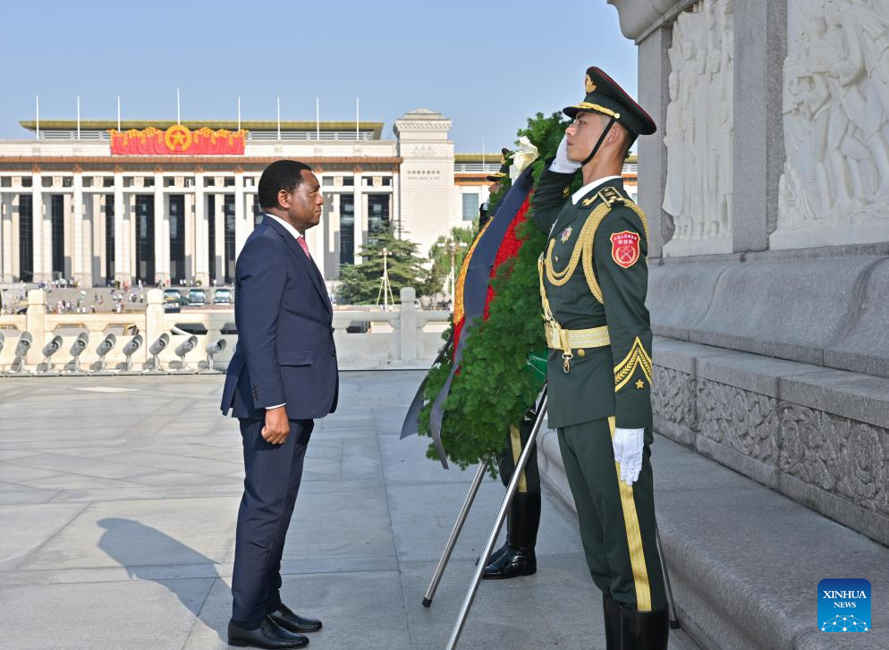 Zambian president lays wreath at Monument to People's Heroes in Beijing