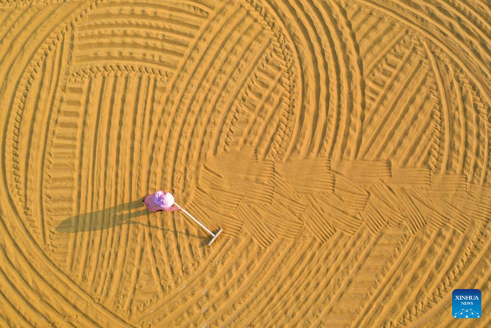 This aerial photo shows a farmer spreading millet to dry in Baofeng County, central China's Henan Province, Sept. 14, 2023. (Photo by He Wuchang/Xinhua)