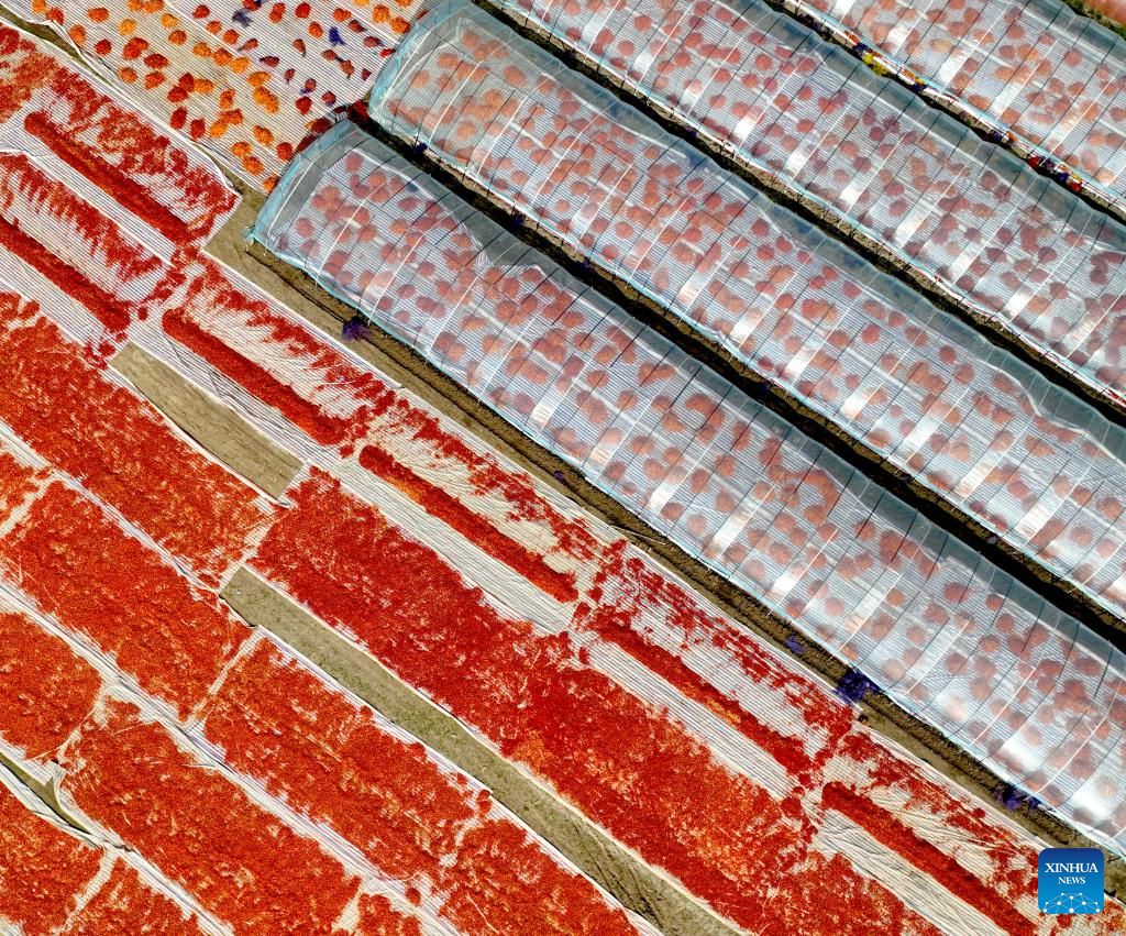 This photo taken on Sept. 14, 2023 shows hot peppers being aired in Renxiaomiao Village of Bozhou, east China's Anhui Province. (Photo by Liu Qinli/Xinhua)