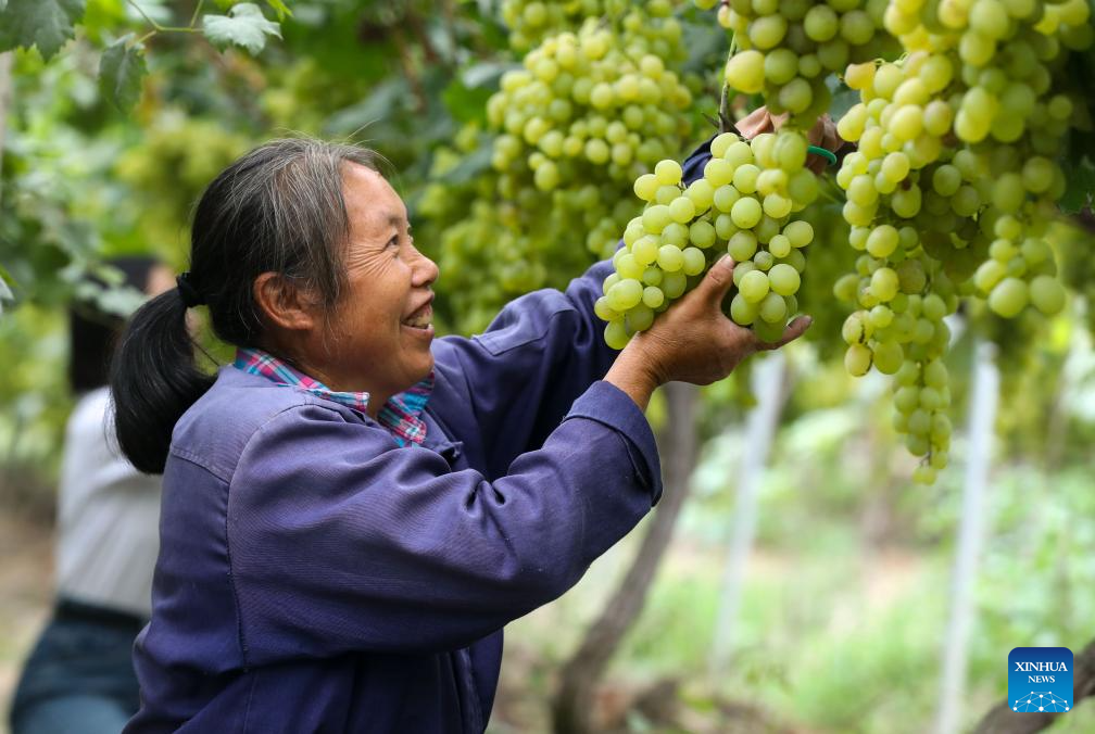 A farmer picks grapes at a fruit planting base in Longguang Village of Kaiyang County, southwest China's Guizhou Province, Sept. 14, 2023. (Photo by Yuan Fuhong/Xinhua)