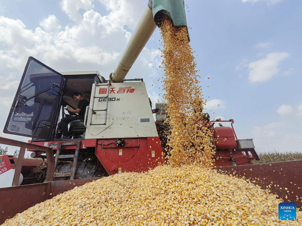 A farmer drives a harvester to harvest corns in Yuanzhuang Village of Zhumadian, central China's Henan Province, Sept. 14, 2023. (Photo by Sun Kai/Xinhua)