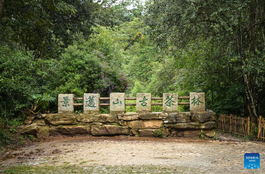 This photo taken on Aug. 29, 2023 shows the entrance of an old tea forest area of Jingmai Mountain in Pu'er, southwest China's Yunnan Province. (Xinhua/Li He)