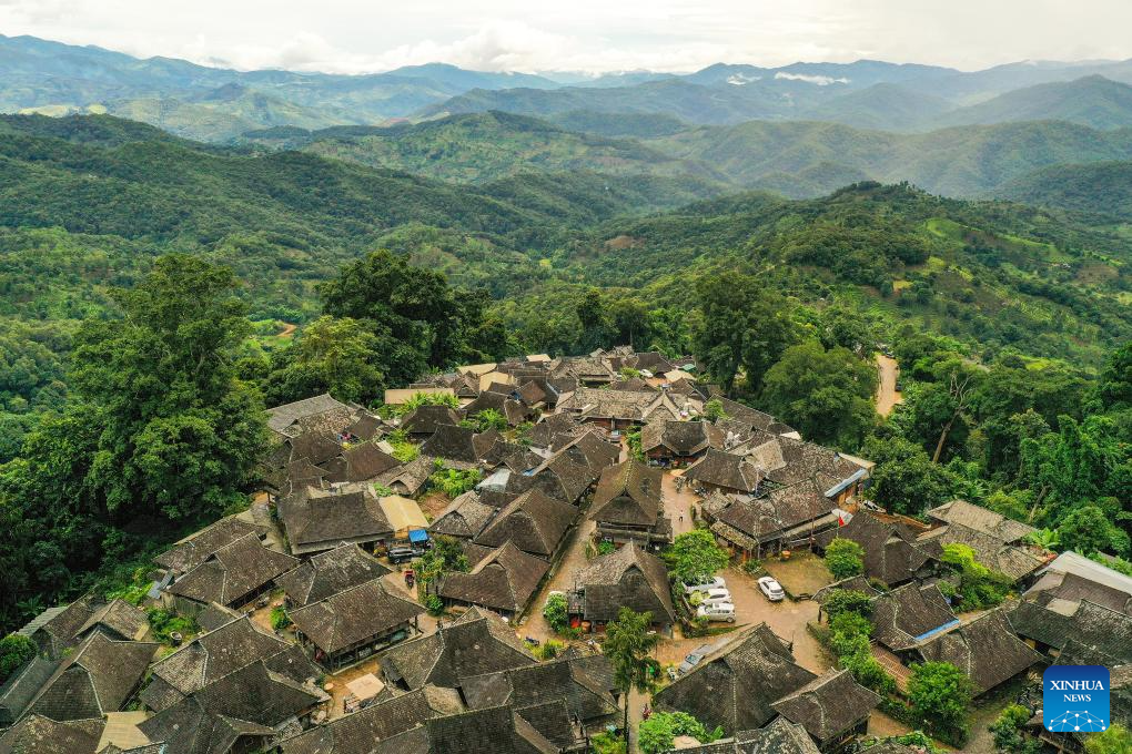 This aerial photo taken on Aug. 29, 2023 shows a traditional village in Jingmai Mountain in Pu'er, southwest China's Yunnan Province. (Xinhua/Li He)