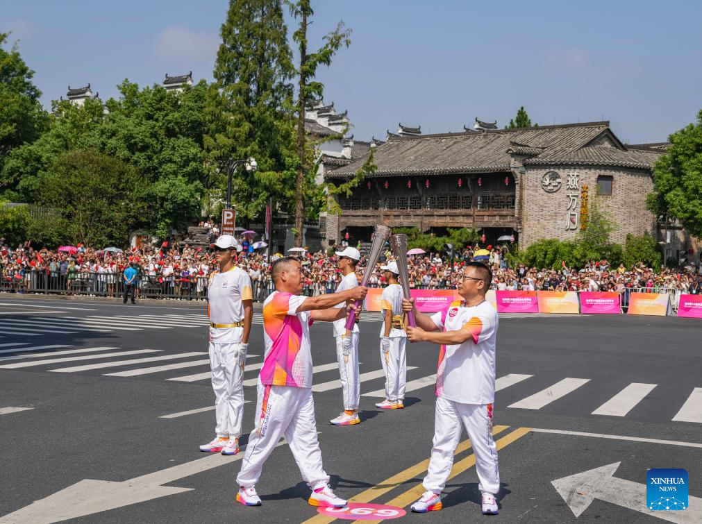 Torch bearers Weng Ying (Top) and Lou Sheng pose during the torch relay of the 19th Asian Games in Jinhua, east China's Zhejiang Province, Sept. 17, 2023. (Xinhua/Sun Fei)