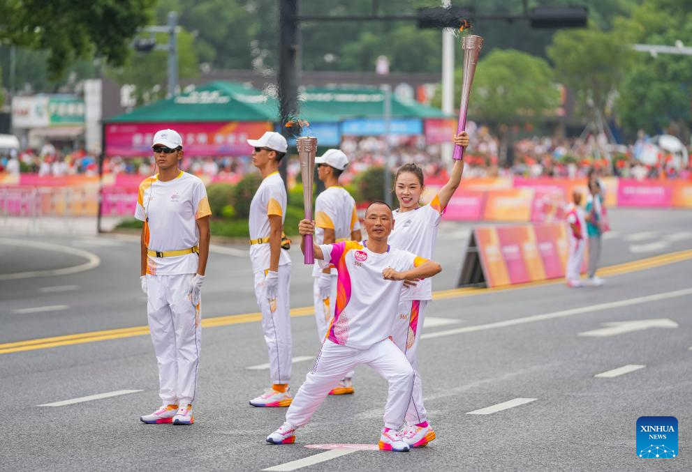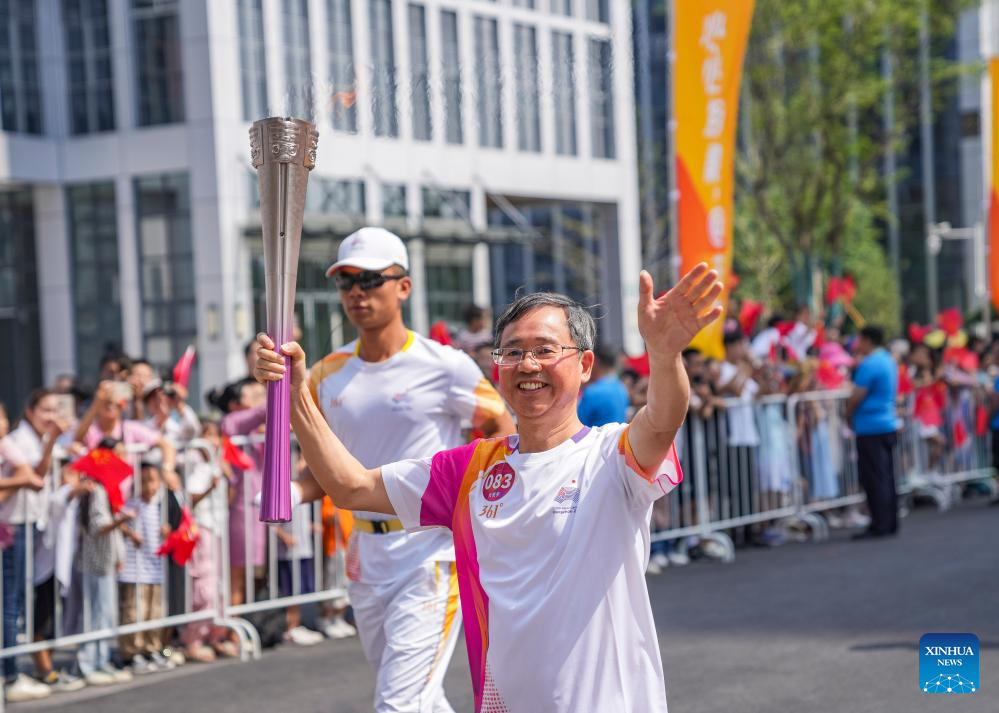 Torch bearer Lou Renbin runs with the torch during the torch relay of the 19th Asian Games in Jinhua, east China's Zhejiang Province, Sept. 17, 2023. (Xinhua/Sun Fei)