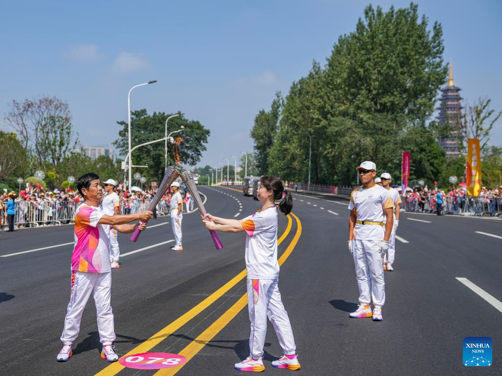 Torch bearers Ma Meihua (L) and Xu Jiezhen pass the flame during the torch relay of the 19th Asian Games in Jinhua, east China's Zhejiang Province, Sept. 17, 2023. (Xinhua/Sun Fei)