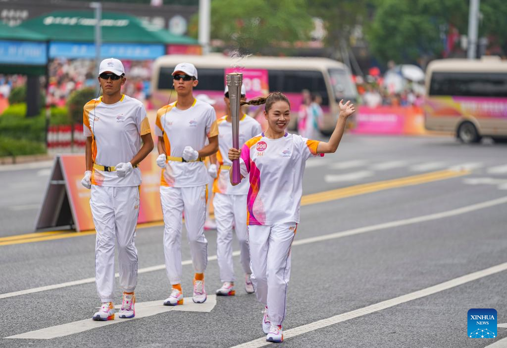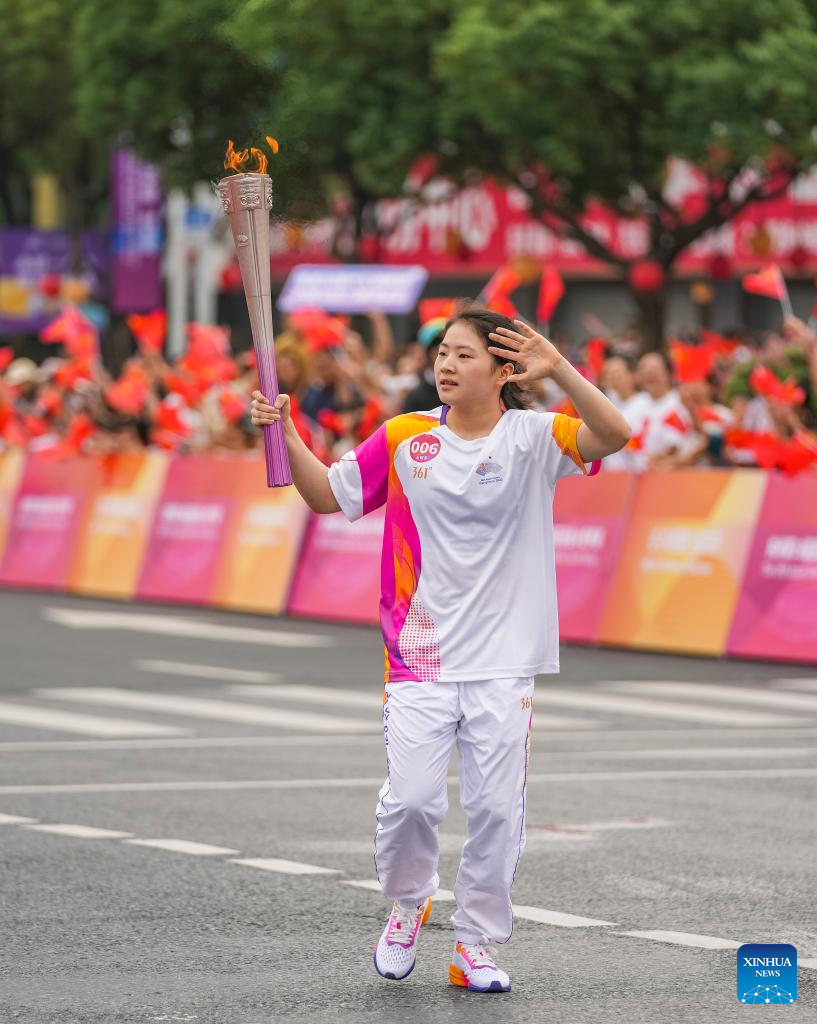 Torch bearer Cheng Ying runs with the torch during the torch relay of the 19th Asian Games in Jinhua, east China's Zhejiang Province, Sept. 17, 2023. (Xinhua/Sun Fei)