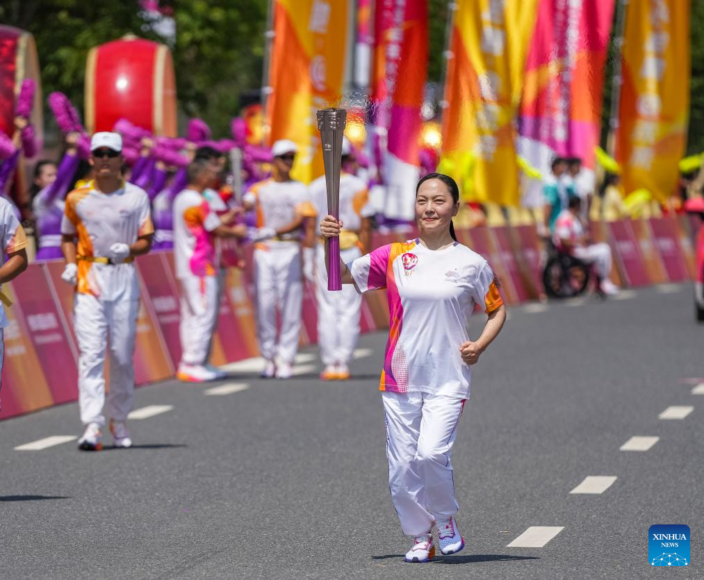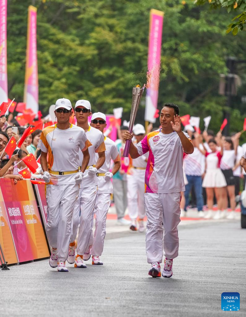 Torch bearer Lin Bin runs with the torch during the torch relay of the 19th Asian Games in Jinhua, east China's Zhejiang Province, Sept. 17, 2023. (Xinhua/Sun Fei)