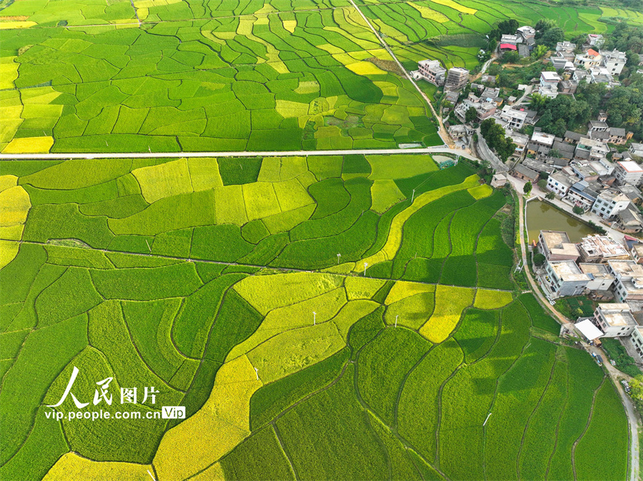 Photo shows rice fields and dwellings nearby in Liufeng townsip, Guiyang county, Chenzhou city, central China's Hunan Province. (vip.people.com.cn/ Zhou Xiuyuchun)