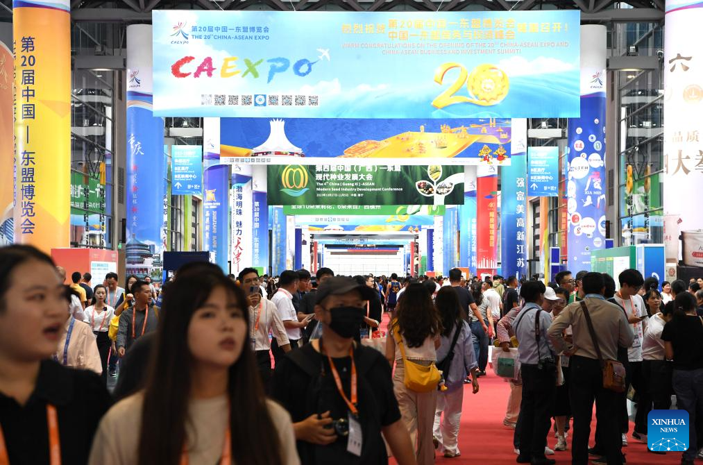 People visit the 20th China-ASEAN Expo at Nanning International Convention and Exhibition Center in Nanning, capital of south China's Guangxi Zhuang Autonomous Region, Sept. 17, 2023. The opening ceremony of the 20th China-ASEAN Expo and China-ASEAN Business and Investment Summit was held on Sunday in Nanning. (Xinhua/Zhou Hua)