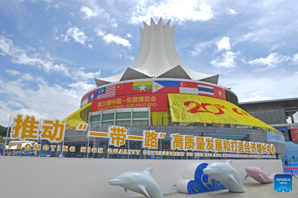 This photo taken on Sept. 17, 2023 shows the Nanning International Conference and Exhibition Center in Nanning, capital of south China's Guangxi Zhuang Autonomous Region. The opening ceremony of the 20th China-ASEAN Expo and China-ASEAN Business and Investment Summit was held on Sunday in Nanning. (Xinhua/Zhou Hua)