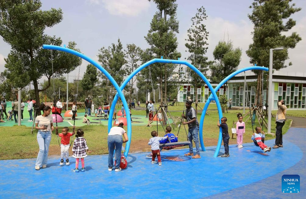 Children have a fun time at a playground in Addis Ababa, Ethiopia, Sept. 16, 2023. As an integral part of the Ethiopian government's city beautification agenda, the China-aided Addis Ababa riverside green development project is expected to greatly improve the surrounding living environment of Addis Ababa, the capital of Ethiopia, with important social, tourism and commercial value. (Xinhua/Wang Ping)