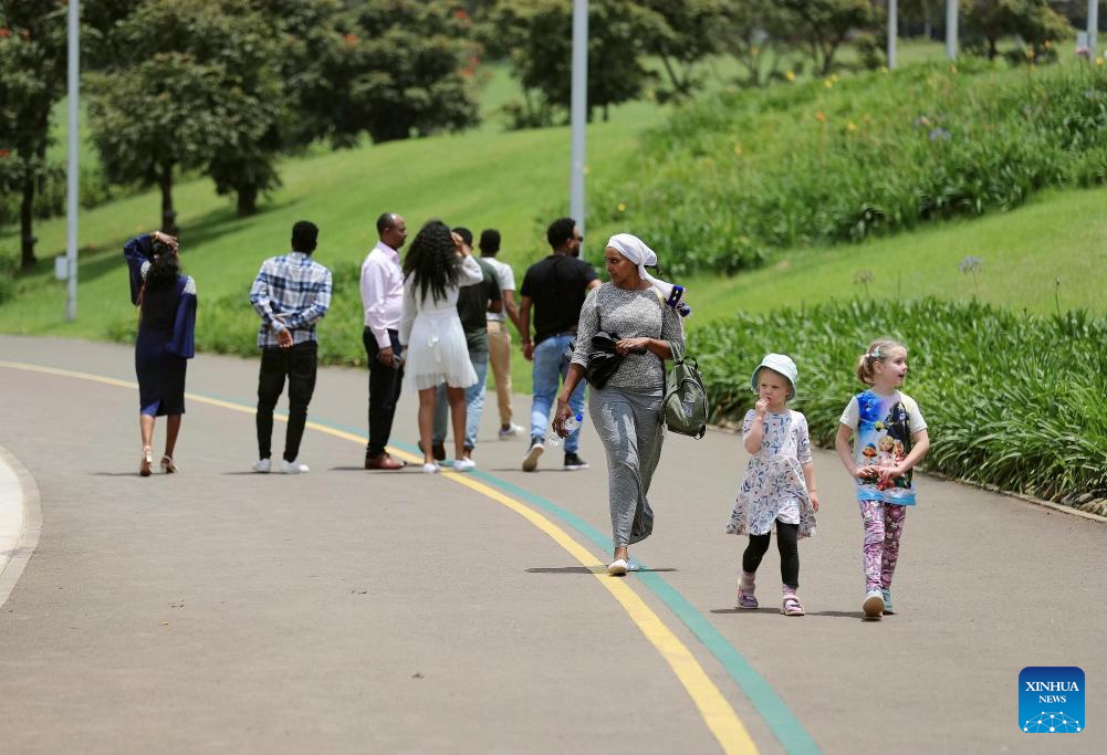 This photo taken on Sept. 16, 2023 shows pedestrians in the Friendship Square in Addis Ababa, Ethiopia. As an integral part of the Ethiopian government's city beautification agenda, the China-aided Addis Ababa riverside green development project is expected to greatly improve the surrounding living environment of Addis Ababa, the capital of Ethiopia, with important social, tourism and commercial value. (Xinhua/Wang Ping)