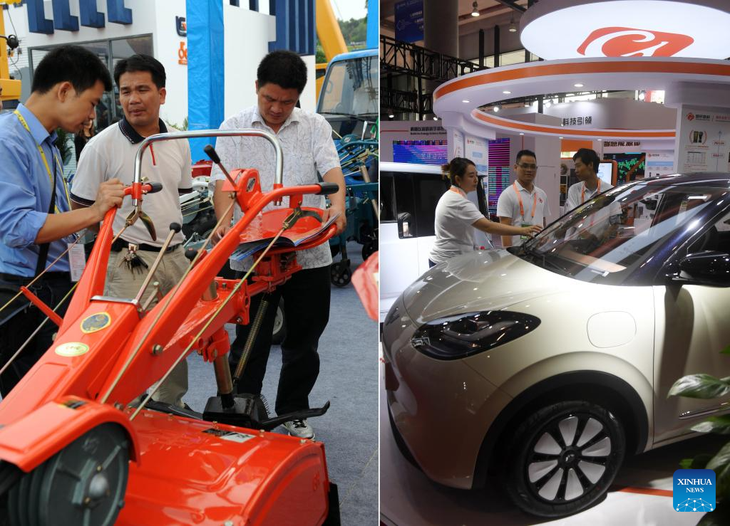 This combo photo shows people looking at a tractor at the 5th China-ASEAN Expo (L, photo taken by Xinhua photographer Liu Guangming on Oct. 25, 2008) and people looking at a car at the 20th China-ASEAN Expo (R, photo taken by Xinhua photographer Lu Boan on Sept. 18, 2023) in Nanning, south China's Guangxi Zhuang Autonomous Region. The 20th China-ASEAN Expo is held in Nanning from September 16-19, with nearly 2,000 enterprises attending.