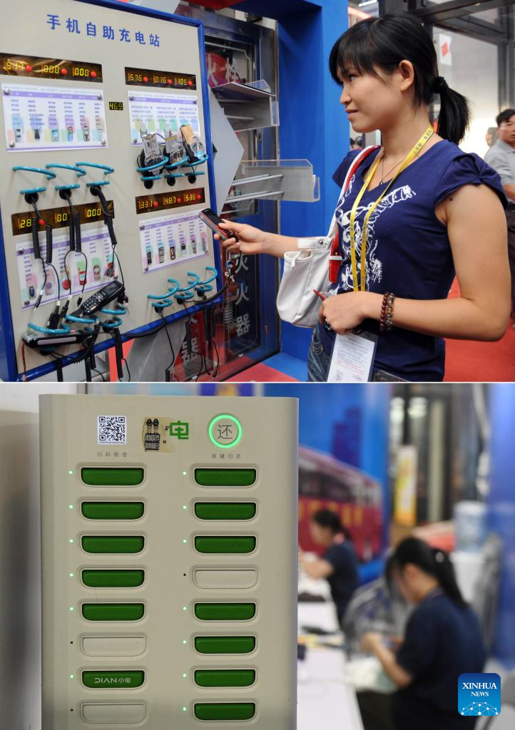 This combo photo shows a woman charging her mobile phone at a self-service charging station at the 5th China-ASEAN Expo (above, photo taken by Xinhua photographer Zhang Ailin on Oct. 25, 2008) and a shared power bank renting device at the 20th China-ASEAN Expo (below, photo taken by Xinhua photographer Lu Boan on Sept. 18, 2023) in Nanning, south China's Guangxi Zhuang Autonomous Region. The 20th China-ASEAN Expo is held in Nanning from September 16-19, with nearly 2,000 enterprises attending.