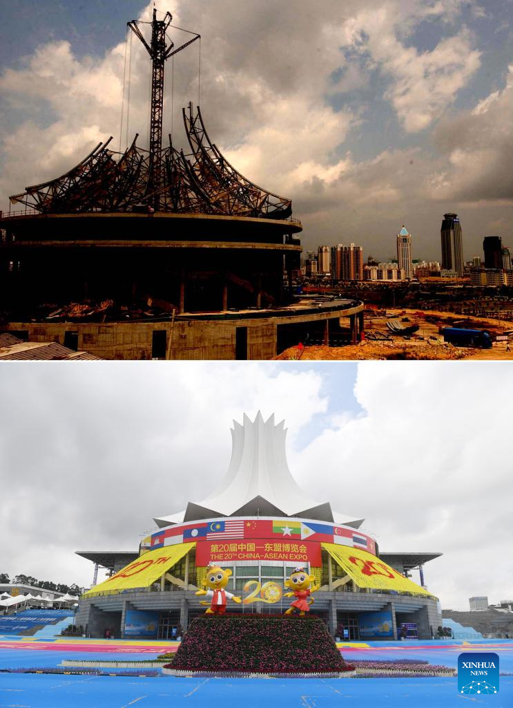 This combo photo shows the construction site of the Nanning International Conference and Exhibition Center (above, photo taken by Xinhua photographer Liu Guangming on May 7, 2003) and a view of the Nanning International Conference and Exhibition Center (below, photo taken by Xinhua photographer Lu Boan on Sept. 17, 2023) in Nanning, south China's Guangxi Zhuang Autonomous Region. The 20th China-ASEAN Expo is held in Nanning from September 16-19, with nearly 2,000 enterprises attending.