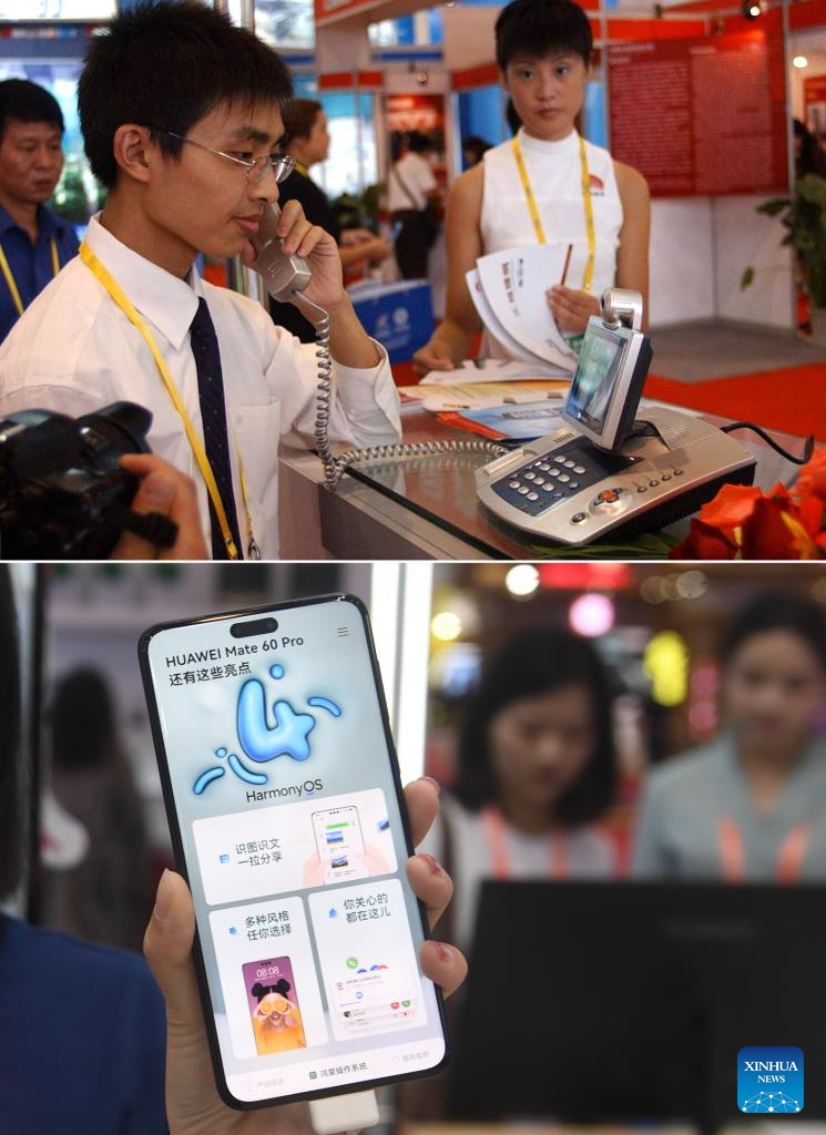 This combo photo shows an exhibitor displaying a telephone at the 2nd China-ASEAN Expo (above, photo taken by Xinhua photographer Liu Guangming on Oct. 19, 2005) and a staff member showcasing a smart phone at the 20th China-ASEAN Expo (below, photo taken by Xinhua photographer Lu Boan on Sept. 18, 2023) in Nanning, south China's Guangxi Zhuang Autonomous Region. The 20th China-ASEAN Expo is held in Nanning from September 16-19, with nearly 2,000 enterprises attending.