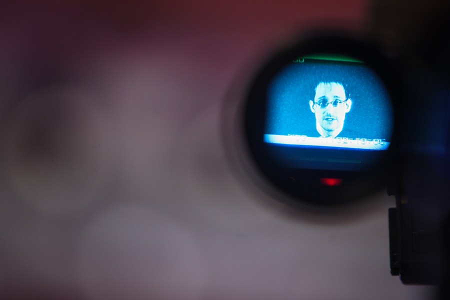 File photo taken on March 18, 2015 shows Edward Snowden on the display of a camera during a live remote interview at CeBIT 2015, the world's top trade fair for information and communication technology, in Hanover, Germany. (Xinhua/Zhang Fan)