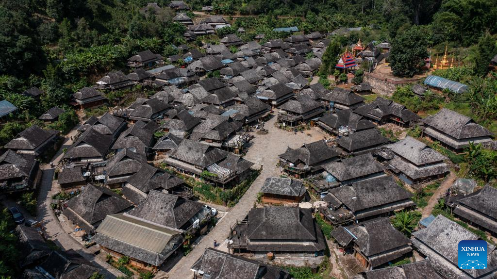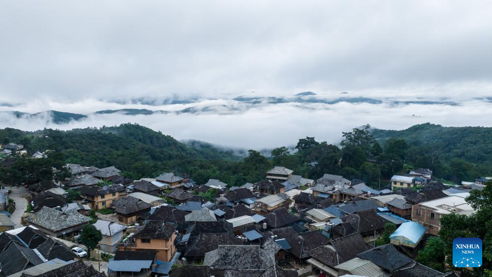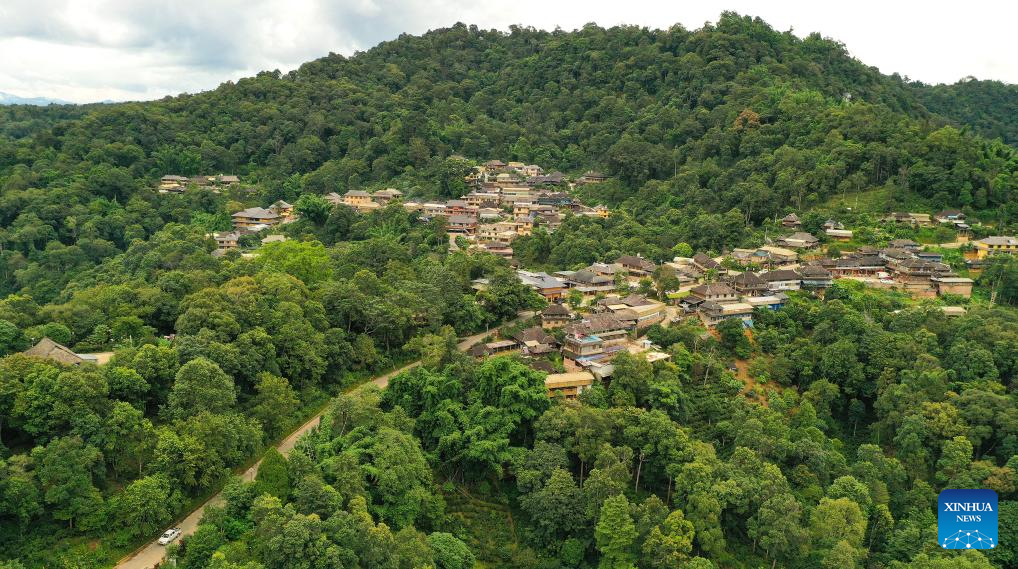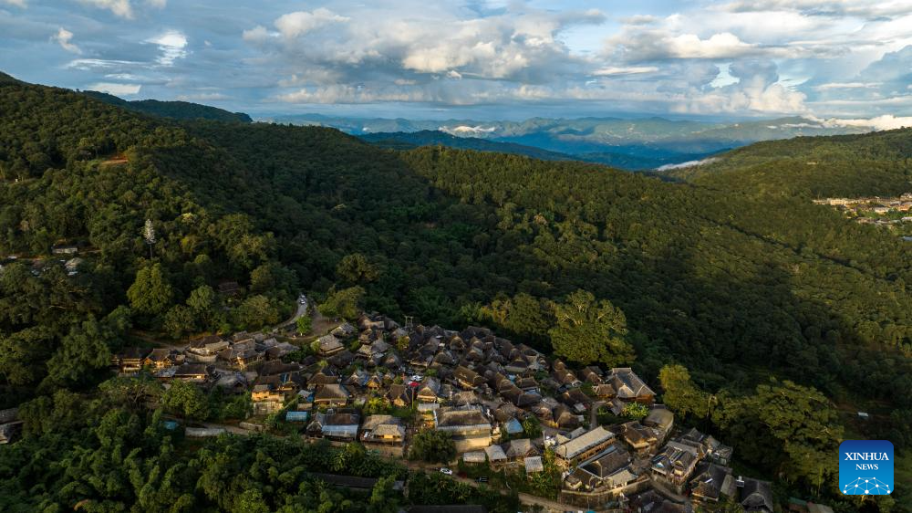 This aerial photo taken on Sept. 18, 2023 shows the Wengji Village in Pu'er City, southwest China's Yunnan Province. The Cultural Landscape of Old Tea Forests of Jingmai Mountain in Pu'er was inscribed on the UNESCO World Heritage List on Sunday at the extended 45th session of the UNESCO World Heritage Committee in Riyadh, Saudi Arabia, making it China's 57th World Heritage Site. (Xinhua/Hu Chao)