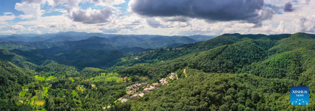 This panoramic aerial photo taken on Sept. 18, 2023 shows the Wengji Village in Pu'er City, southwest China's Yunnan Province. The Cultural Landscape of Old Tea Forests of Jingmai Mountain in Pu'er was inscribed on the UNESCO World Heritage List on Sunday at the extended 45th session of the UNESCO World Heritage Committee in Riyadh, Saudi Arabia, making it China's 57th World Heritage Site. (Xinhua/Hu Chao)