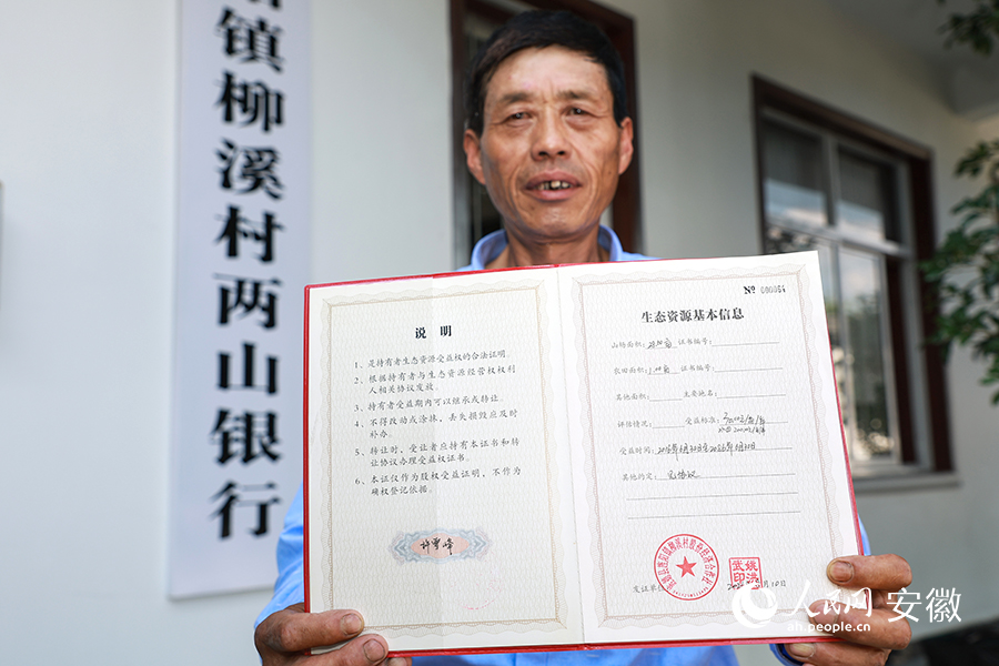 Xu Xuefeng, a villager from Liuxi village, Jingde county, east China's Anhui Province, shows a certificate which proves that he is a beneficiary of the ecological resources transfer program. (People’s Daily Online/Zhang Jun)
