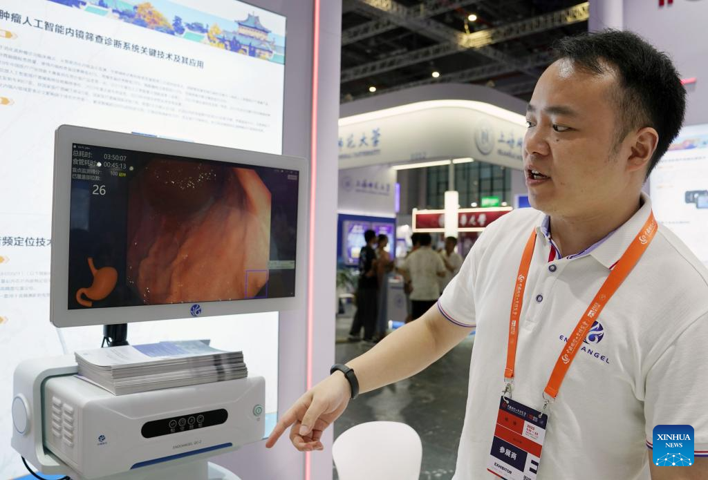 A staff member introduces an endoscopic screening and diagnosis system for gastrointestinal tumors based on AI technology at the stand of Wuhan University at the 23rd China International Industry Fair in Shanghai, east China, Sept. 20, 2023. More than 800 projects from over 80 universities are displayed at the exhibition area of universities at the ongoing 23rd China International Industry Fair. (Xinhua/Liu Ying)