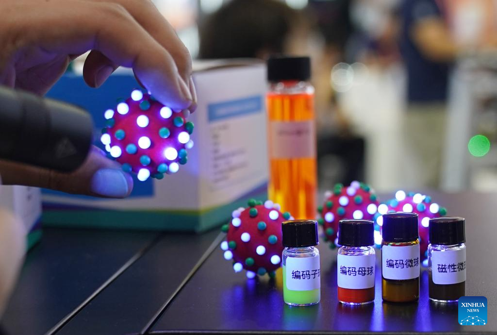 A staff member uses models to introduce a multi-index detection technology of new coding liquid chips at the stand of Shanghai Jiaotong University at the 23rd China International Industry Fair in Shanghai, east China, Sept. 19, 2023. More than 800 projects from over 80 universities are displayed at the exhibition area of universities at the ongoing 23rd China International Industry Fair. (Xinhua/Liu Ying)