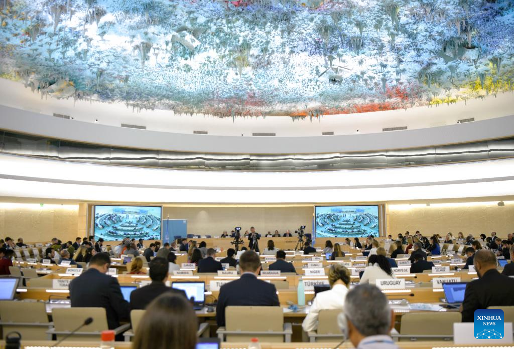 This photo taken on Sept. 20, 2023 shows the 54th Human Rights Council, in Geneva, Switzerland. China and like-minded countries on Wednesday highlighted the importance of promoting inclusive societies to benefit women with disabilities and to contribute to their equal life and development. (Xinhua/Lian Yi)