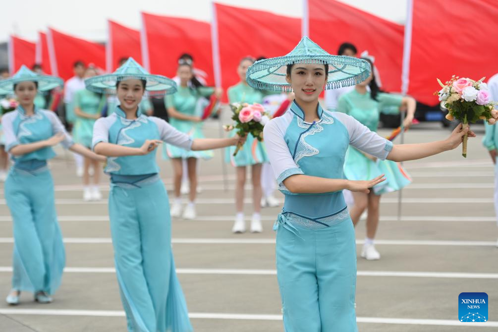 A welcoming ceremony is held upon the arrival of Crown Prince of Kuwait Sheikh Mishal Al-Ahmad Al-Jaber Al-Sabah in Hangzhou, capital city of east China's Zhejiang Province, Sept. 21, 2023. Kuwaiti crown prince on Thursday arrived here to attend the opening ceremony of the 19th Asian Games. (Xinhua/Huang Zongzhi)