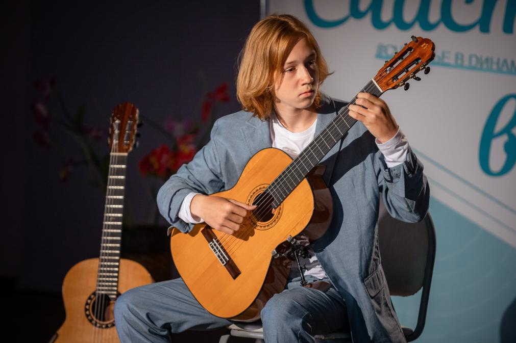 A student of Russian guitarist Grigory Novikov plays a guitar produced by Natasha Musical Instrument Manufacturing Co., Ltd. at a musical school in Perm, Russia, Aug. 23, 2022. (Xinhua)