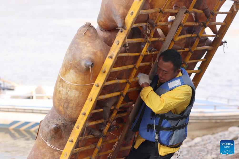 Niu Qiang fixes a sheepskin raft in Lanzhou, northwest China's Gansu Province, Sept. 5, 2023. (Xinhua/Xing Guangli)