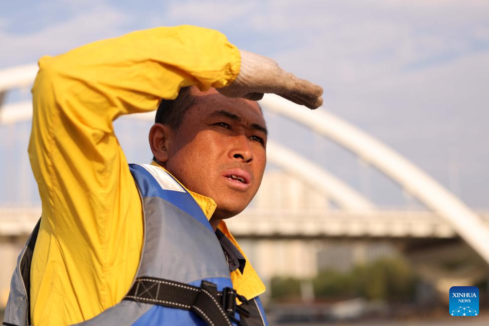 Niu Qiang carries tourists with a sheepskin raft on the Yellow River in Lanzhou, northwest China's Gansu Province, Sept. 5, 2023. Niu Qiang, a sheepskin raft worker from Huining of northwest China's Gansu Province, has been doing the job for 27 years since 16 years old on the Lanzhou section of the Yellow River. (Xinhua/Xing Guangli)