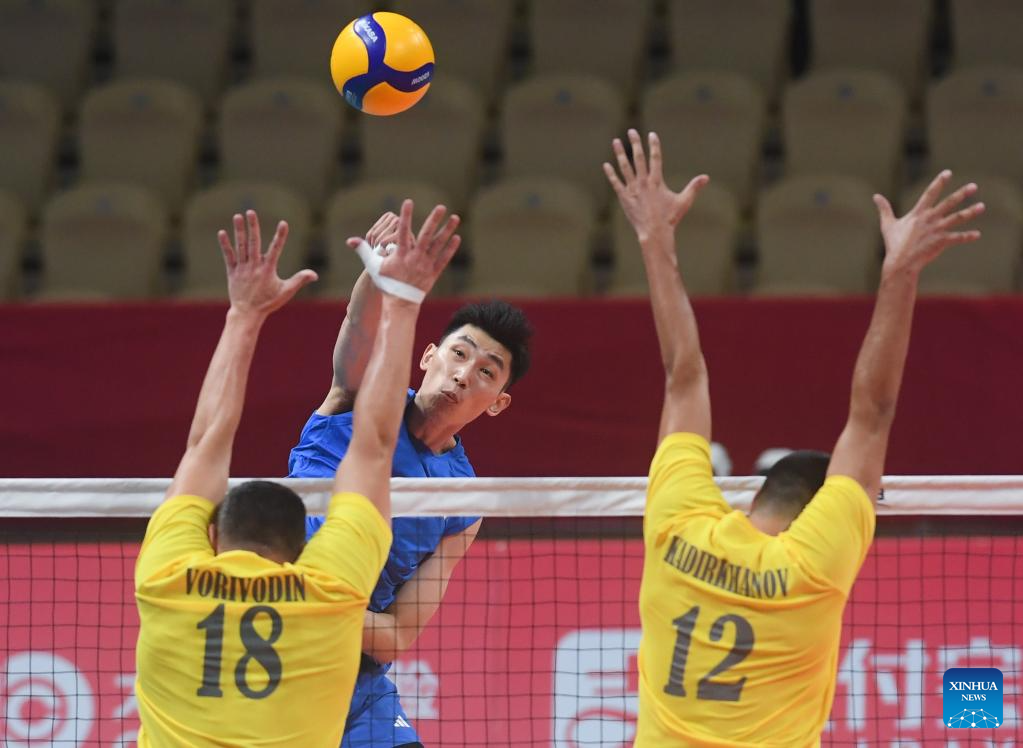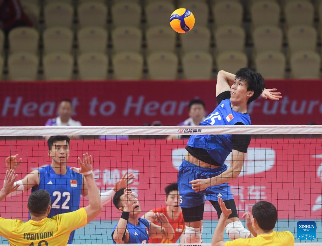 Zhaxylyk Tleulin (2nd L) of Kazakhstan spikes the ball during the Volleyball Men's Preliminary Round Pool A match between China and Kazakhstan at the 19th Asian Games in Shaoxing, east China's Zhejiang Province, Sept. 21, 2023. (Xinhua/Weng Xinyang)