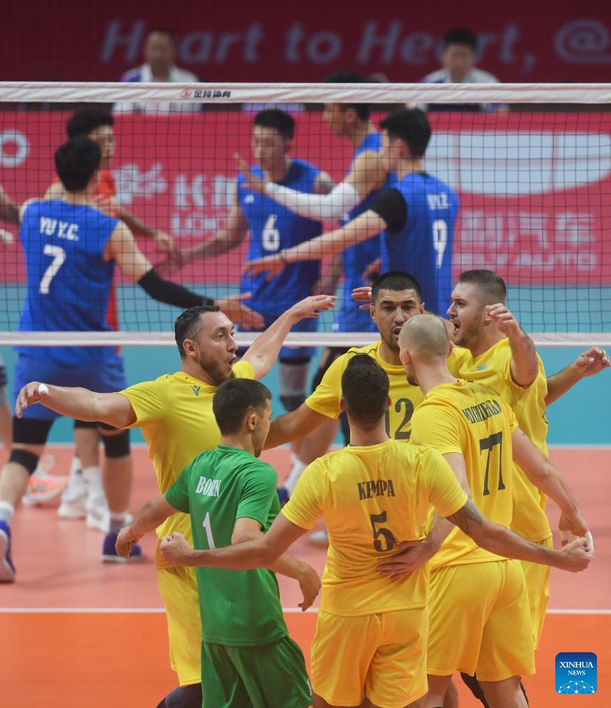 Players of Kazakhstan celebrate after scoring during the Volleyball Men's Preliminary Round Pool A match between China and Kazakhstan at the 19th Asian Games in Shaoxing, east China's Zhejiang Province, Sept. 21, 2023. (Xinhua/Weng Xinyang)