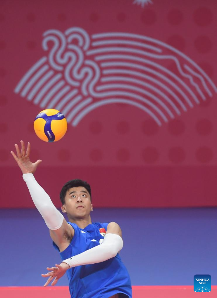 Zhang Jingyin of China competes during the Volleyball Men's Preliminary Round Pool A match between China and Kazakhstan at the 19th Asian Games in Shaoxing, east China's Zhejiang Province, Sept. 21, 2023. (Xinhua/Weng Xinyang)