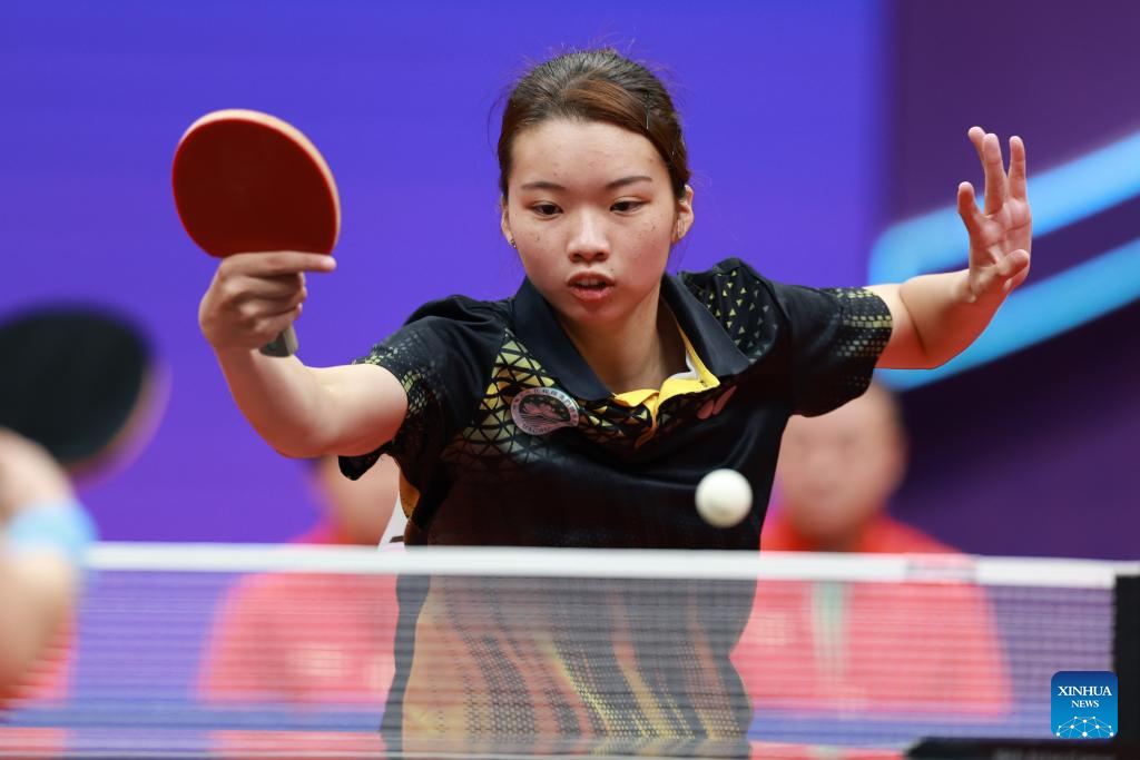 Wang Manyu of China competes against Cheong Chi Hun of China's Macao during the women's team preliminary group A match between China and China's Macao at the 19th Asian Games in Hangzhou, east China's Zhejiang Province, Sept. 22, 2023. (Xinhua/Liu Xu)