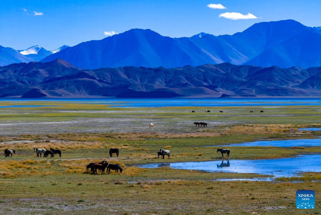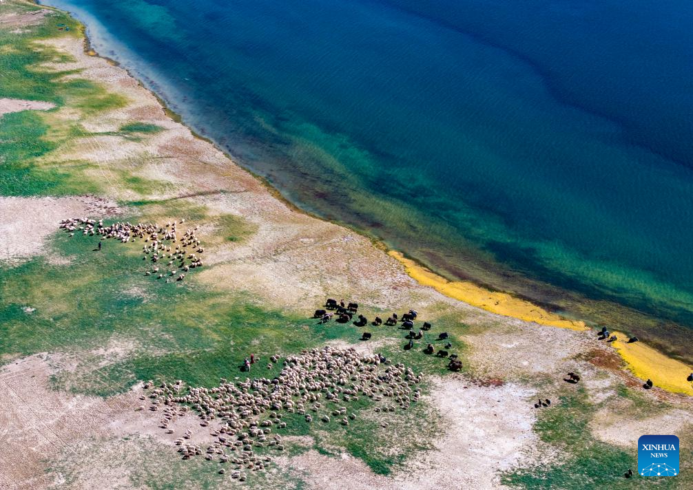 This aerial photo taken on Sept. 21, 2023 shows herders grazing their livestock by the Banggong Co in Rutog County of Ngari Prefecture of southwest China's Tibet Autonomous Region. (Xinhua/Jiang Fan)