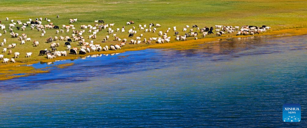 This aerial photo taken on Sept. 21, 2023 shows livestock by the Banggong Co in Rutog County of Ngari Prefecture of southwest China's Tibet Autonomous Region. (Xinhua/Jiang Fan)