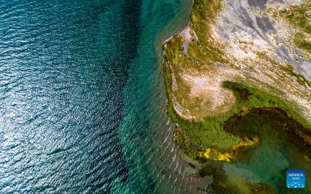 This aerial photo taken on Sept. 21, 2023 shows wetlands by the Banggong Co in Rutog County of Ngari Prefecture of southwest China's Tibet Autonomous Region. (Xinhua/Jiang Fan)
