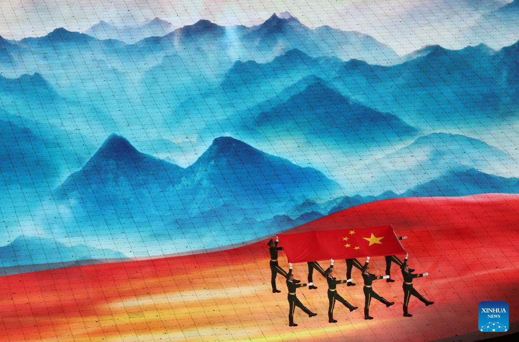 Flag bearers carry the Chinese national flag into the Hangzhou Olympic Sports Center Stadium during the opening ceremony of the 19th Asian Games in Hangzhou, east China's Zhejiang Province, Sept. 23, 2023. (Xinhua/Jia Haocheng)