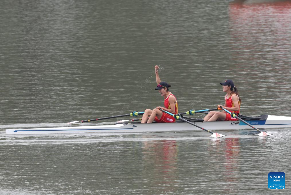 Zou Jiaqi (L) and Qiu Xiuping of China compete during the Women's Lightweight Double Sculls final of rowing at the 19th Asian Games in Hangzhou, east China's Zhejiang Province, Sept. 24, 2023. (Xinhua/Jia Haocheng)