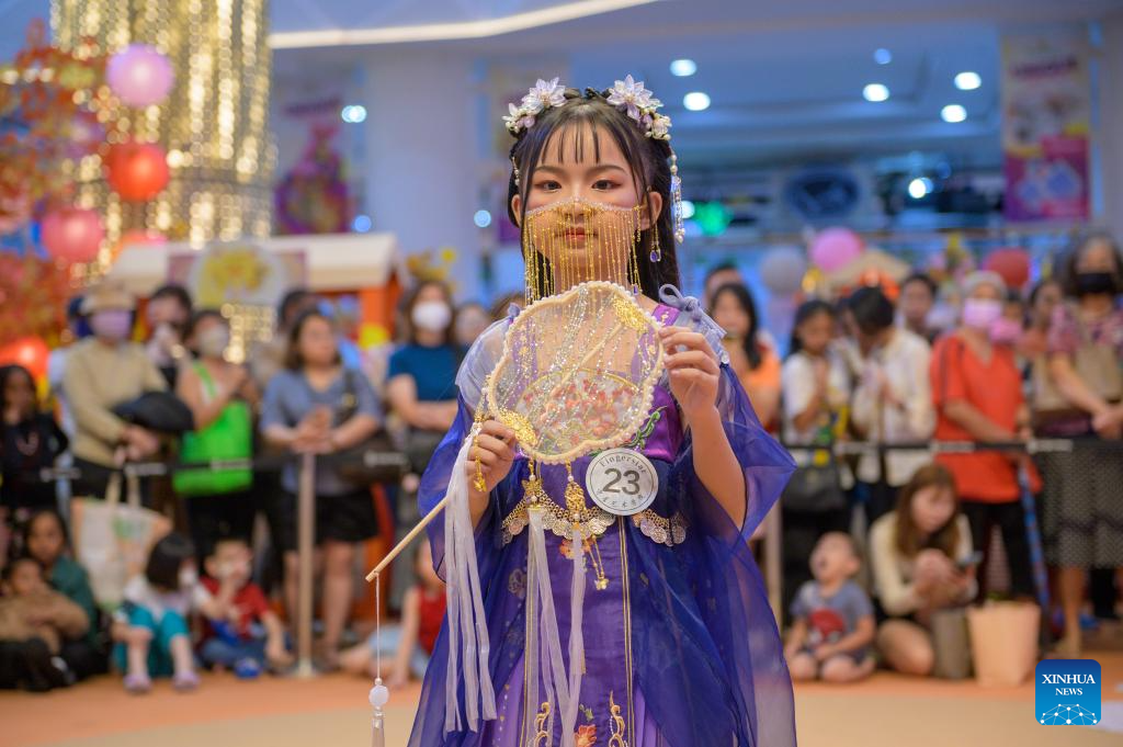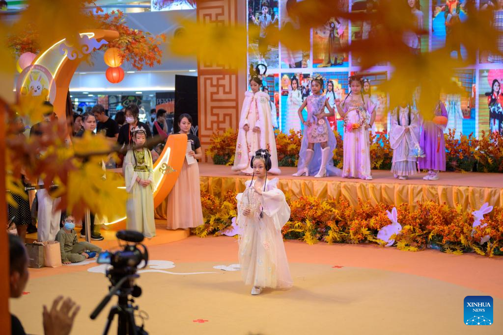 A girl wearing Hanfu, an ancient clothing traditionally used to be worn by ethnic-majority Han Chinese, participates in an event to celebrate the upcoming Mid-Autumn Festival in Kuala Lumpur, Malaysia, Sept. 24, 2023. (Photo by Chong Voon Chung/Xinhua)