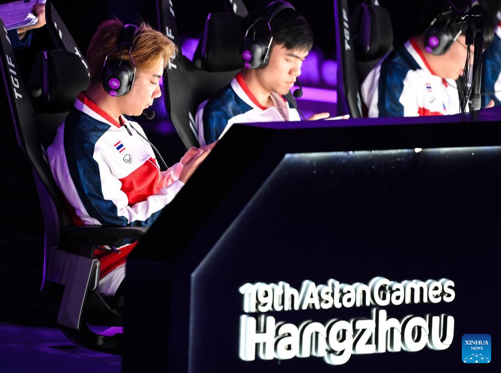 Team Thailand compete during the Arena of Valor Asian Games Version Group D match of Esports at the 19th Asian Games in Hangzhou, east China's Zhejiang Province, Sept. 24, 2023. (Xinhua/Yan Linyun)