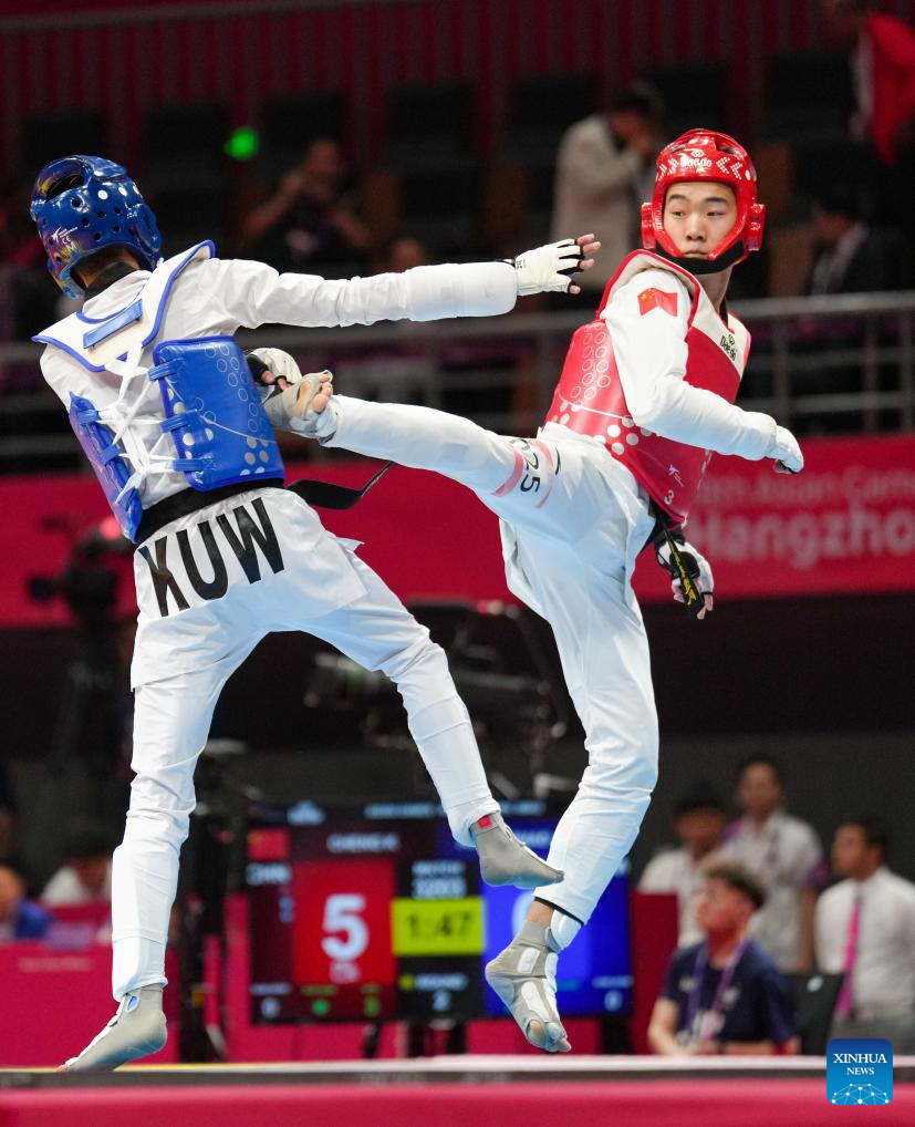 Cheng Kai (C) of China competes against Ali Almershad of Kuwait during the Taekwondo Men's 58kg Round of 32 at the 19th Asian Games in Hangzhou, east China's Zhejiang Province, Sept. 25, 2023. (Xinhua/Jiang Wenyao)