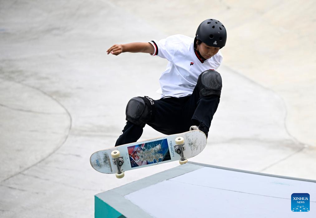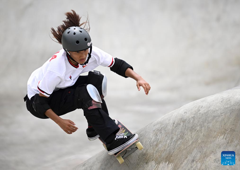 Kusaki Hinano of Japan competes during the Women's Park Final of Skateboarding at the 19th Asian Games in Hangzhou, east China's Zhejiang Province, Sept. 25, 2023. (Xinhua/Pan Yulong)