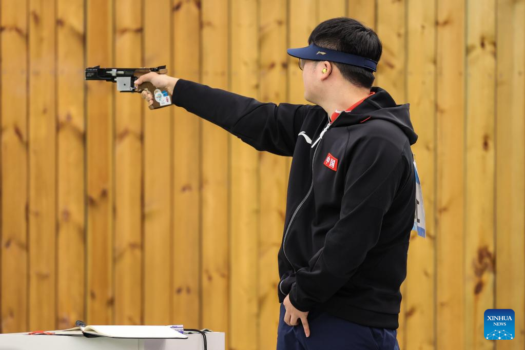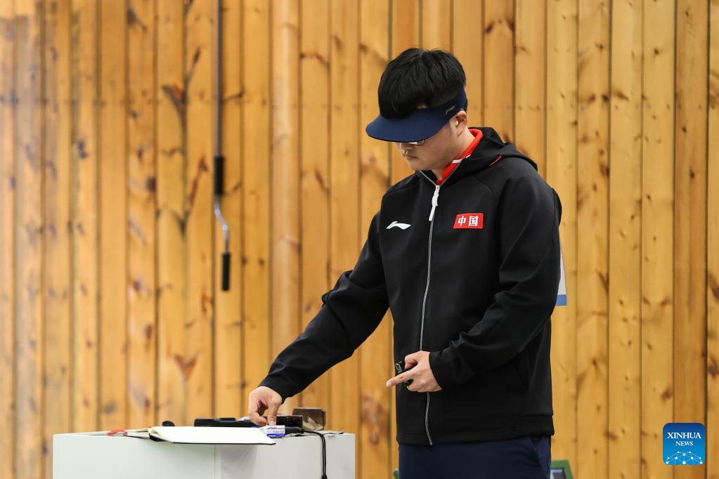 Liu Yangpan of China prepares to compete during the Men's Team 25m Rapid Fire Pistol of Shooting at the 19th Asian Games in Hangzhou, east China's Zhejiang Province, Sept. 25, 2023. (Xinhua/Shan Yuqi)